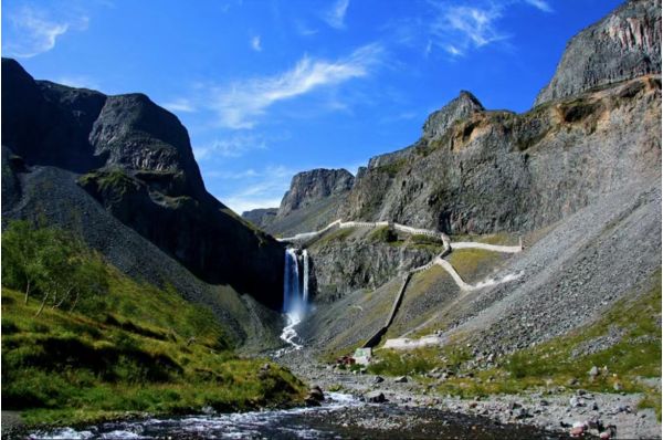 冰涼的河水先是在一段約有600米平緩的地勢里輕歌曼舞般地悠然地散步。緊接著地勢突然向北陡斜,輕緩的河水也立刻情緒沖動起來,暴躁、奔騰、咆哮,一副桀驁不馴的架勢,一路而來跳躍,在距天池約1250米的地方經伏牛石巨石的切割,河水改做一大一小的兩股從懸崖上一躍而起,從懸崖峭壁上飛流直下68米,與天然屏障玉壁,金壁相映,恰似兩條玉龍從天而降。飛跌過程中兩條玉龍攪合在一起,水勢更加兇猛,張開大口勇猛地吞噬著突起的石灘,沖向深深的潭底濺起幾丈高的飛浪,十幾丈的水霧,形成了壯美的長白飛瀑。