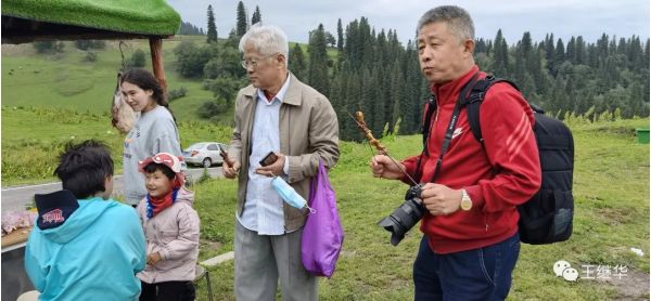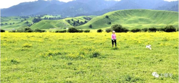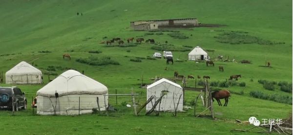 有一個在此休息的導游告訴我們山頂上漂亮可以到山頂上去放無人機,。到山頂有電瓶車票價120。我們6個人包了一輛車,司機叫老張,中等個風吹日曬的黑臉布滿了皺褶。他很熱情主動的介紹山上的情況,開車的時候主動問我們新疆第一大民族是什么民族,我們說是哈薩克,他在前面開著車說:錯。是維族,他又問第二大民族是什么,我們說哈薩克,他得意的說:還是錯,是漢族。他又問第三大民族是什么,我們說哈薩克,他說對了。他又問,你知道那拉提是什么意思,我們說不知道,他說哈薩克語是太陽升起的地方。老張接著自我介紹他也是一個漢族,今年59歲,家在100公里外的公留縣,老婆是一個教師,很漂亮。開私家車來這上班,宿舍就在山下公司宿舍。和山上氈房里的哈薩克牧民都非常熟悉。言語之間露出一些自豪。