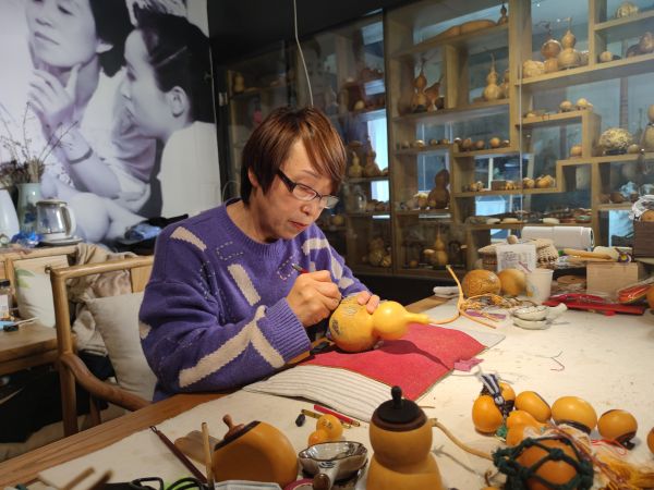如今,阮琳已將工作重心放在了蘭州刻葫蘆非物質文化遺產的保護和傳播上。她要么參加各種文化方面的交流培訓會議,向更多人介紹蘭州刻葫蘆;要么在傳習所為游客講解刻葫蘆技藝和文化,指點客人自制一件刻葫蘆作品。