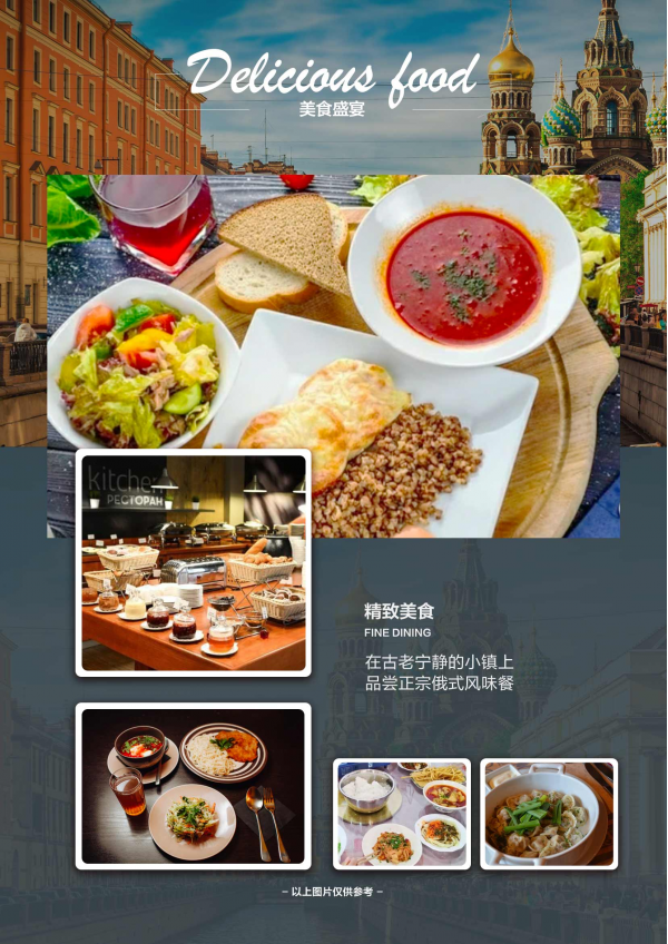 午、晚餐:中式正餐(八菜一湯)及俄式風味餐 ;