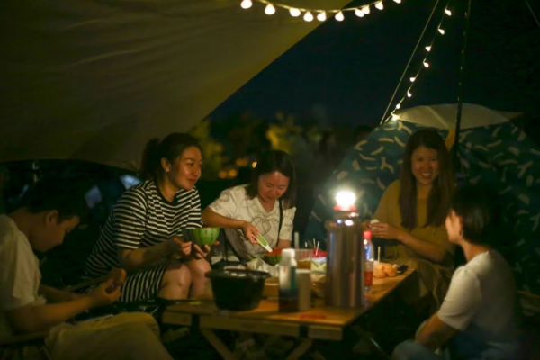 在滿眼星空的南山下安營扎寨,遠(yuǎn)處,山嶺安然靜謐,將人環(huán)抱其中。陽光褪去的山間夜晚,微風(fēng)輕拂。伴隨著蟬鳴蛙叫,一家人靜享在山腳下的特別夜晚。
