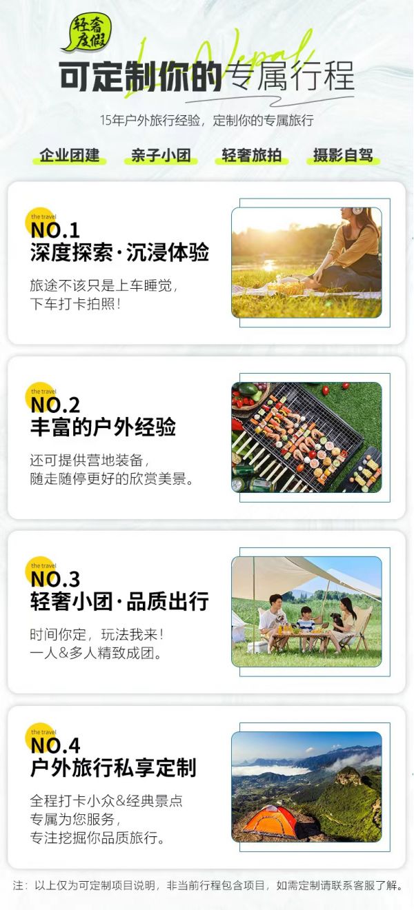 私人訂制:我們業(yè)務范圍囊括了全國各大城市,川西、西北、西藏、新疆,在路上永遠有我們的身影。我們將為每一個有定制需求的你策劃出獨屬于自己的完美旅行。