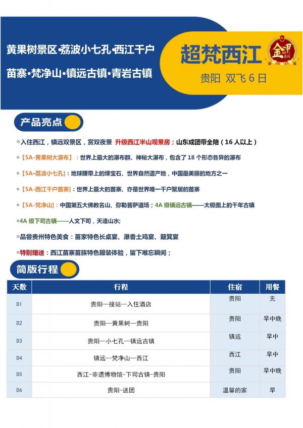 貴州6日游 聊城發團 純玩 無購物 貴陽 黃果樹 小七孔 鎮遠古鎮 梵凈山 西江 非遺博物館 下司古鎮 發團日期 20230619-20230624 價格 3680 報名電話 0635 8681234