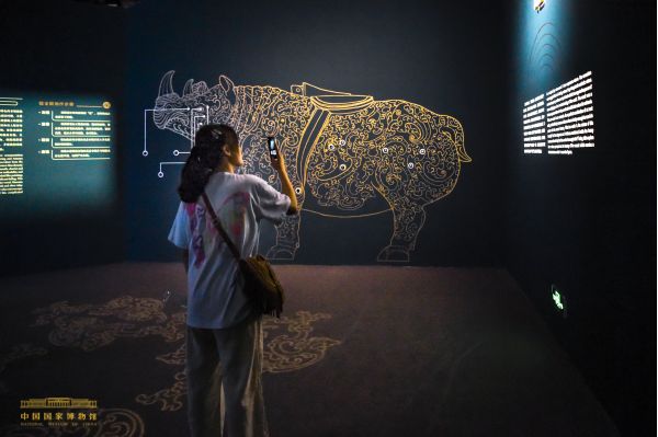 “數說犀尊”展覽以一物一展的形式,從出土經歷、功能特點、鑄造和裝飾工藝、造型美學等方面對西漢錯金銀云紋銅犀尊進行全方位解讀,并突破常規展陳手段,綜合運用高清三維掃描、超高清顯示、人工智能、紅外感應、AOA定位、增強現實、環境監測等技術,一方面通過數字手段直觀呈現文物高清細節和科學研究成果,讓游客從單純的參觀者變成探索者、參與者,從視、聽、觸、互動思考等多維度深入感受犀尊所承載的價值;另一方面,在展廳內再現文物采集、應用場景和數字運行平臺,實現智能管理,同時通過互動設備將數字展廳與陳列原文物的“古代中國”展廳聯動起來,使游客的視野從一個展覽延伸到多個展覽,在感悟歷史的同時,切身體會到現代技術帶給博物館的無限可能。