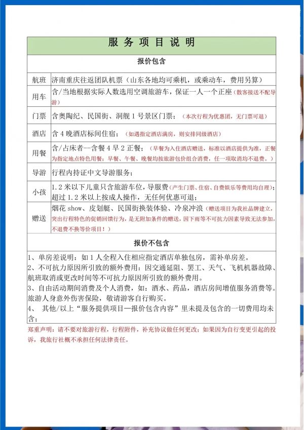 重慶雙飛5日游 聊城發(fā)團 純玩 無購物 重慶奧陶紀題公園 統(tǒng)景風(fēng)景區(qū) 民國街 黃桷坪涂鴉街 中山四路 洪崖洞 磁器口 輕軌穿樓 ...... 發(fā)團日期 2023061620230621 價格 3990 報名電話 0635 8681234