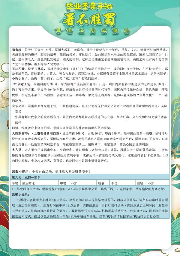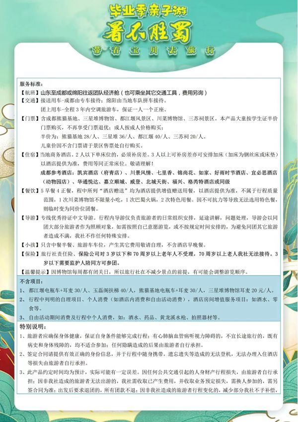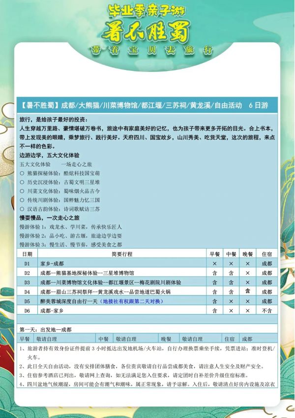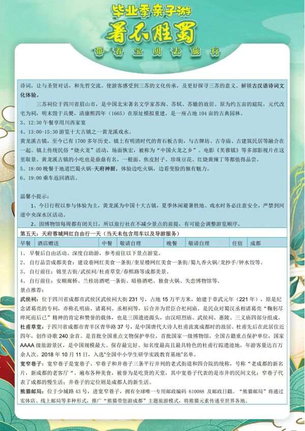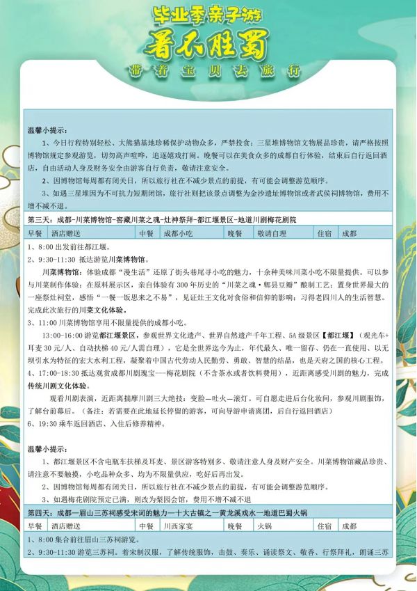 成都雙飛6日游 聊城發團 純玩 無購物 成都 都江堰 熊貓基地 三星堆 三蘇祠黃龍溪 川菜博物館 川劇表演 自由活動 ...... 發團時間 20230616 20230618 20230620 20230630 價格 3990 4290 報名電話 0635 8681234