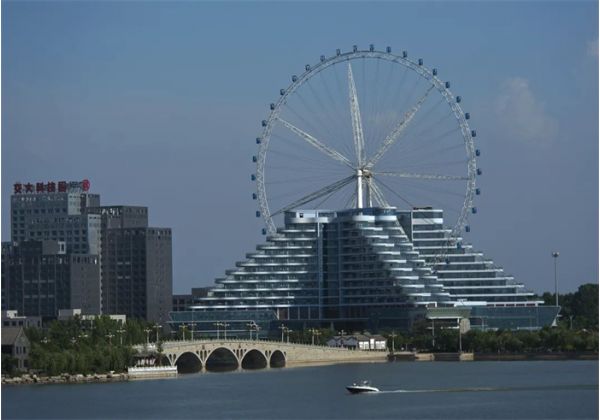 中華路徒駭河大橋的橋塔造型在設計的時候,便融合了水城的概念,將一顆圓潤的明珠托舉在空中旋轉,朦朧的夜色之下,現代的霓虹燈柔和又絢爛。