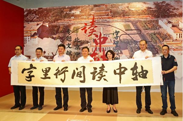 活動開幕儀式現場,北京市文物局副局長褚建好,北京市文化和旅游局副局長王洪濤,北京市東城區副區長唐立,展覽主辦單位以及北京京企中軸線保護公益基金會的嘉賓共同展開寫有“字里行間讀中軸”的卷軸,一場講述壯觀中軸、人文中軸、多彩中軸的展覽正式拉開序幕。