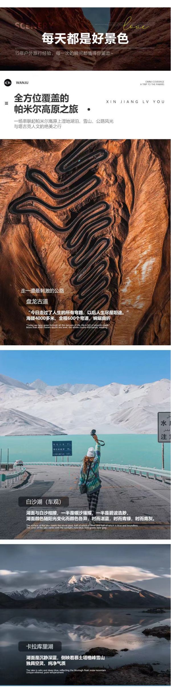 “今日走過了人生的所有彎路,以后人生盡是坦途。”這是出現(xiàn)在新疆帕米爾高原盤龍古道兩頭的宣傳語。繼續(xù)前行,我們會遇見著名網(wǎng)紅打卡地【盤龍古道】。這條70多公里的馬路,卻有600多個彎道,海拔最高有4000多,從山頂俯瞰整個古道,蜿蜒曲折,遠方還有連綿不斷的雪山,視覺效果十分震撼。