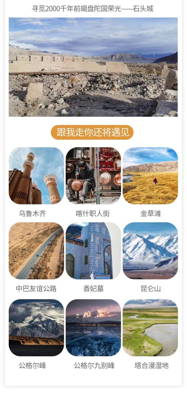 酒店早餐后,后乘車前往瓦恰鄉(xiāng),沿塔莎古道進入昆侖山腹地,據(jù)說這是高僧玄奘取經(jīng)回歸大唐所經(jīng)之路。我們會途經(jīng)【班迪爾湖】,它像是一串灑落在金色沙丘間的藍寶石。接著經(jīng)過【坎爾洋村】,歌曲《花兒為什么這樣紅》的發(fā)源地,塔吉克新娘油畫創(chuàng)作地,無數(shù)畫家、攝影師向往的采風地。