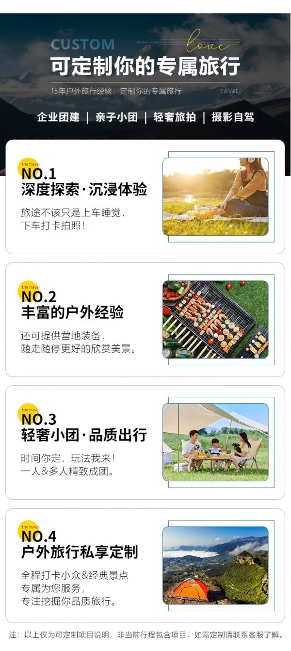 私人訂制:我們業務范圍囊括了全國各大城市,川西、西北、新疆、西藏,在路上永遠有我們的身影。我們將為每一個有定制需求的你策劃出獨屬于自己的完美旅行。