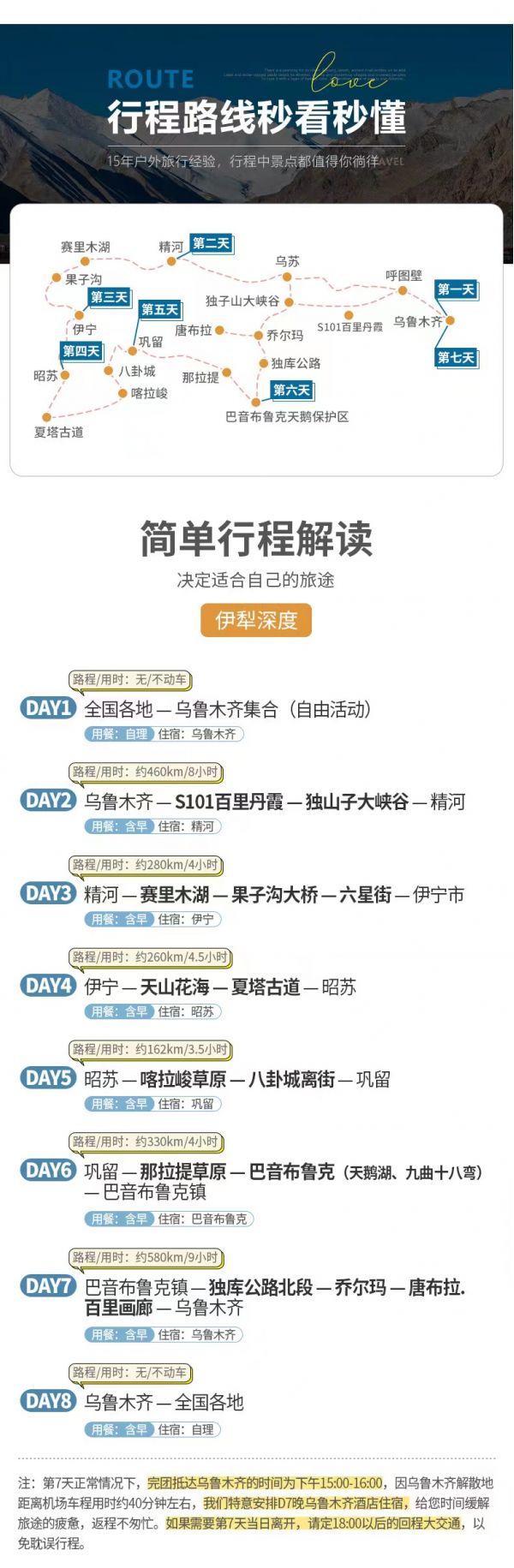 請對應使用我方伊犁深度8日行程,因使用其它行程造成的投訴,責任自負;請仔細閱讀以上行程文檔,同意并保證遵守我方安排,以免為您帶來不必要的麻煩;如產生合同糾紛或人身意外事故,按《中華人民共和國合同法》、《道路交通法》、《保險賠償條例》裁定;本行程作為旅游合同附頁與旅游合同同等法律效力。