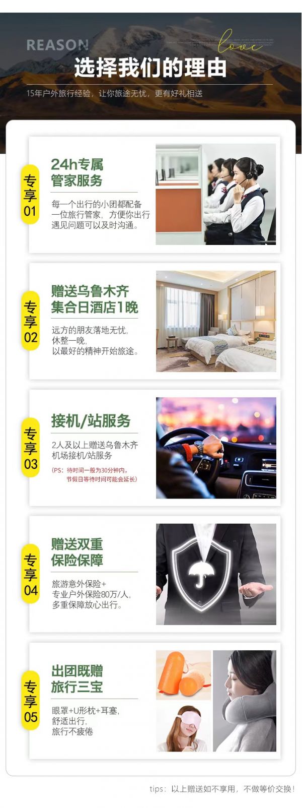 接機站服務:本次活動提供烏魯木齊市內24小時接機/接站服務,工作人員會在您出發日期前一天21:30之前向您推送消息并與您聯系,如果超過時間沒有接到任何通知,請及時與報名處聯系。(接站等待時間一般為15-20分鐘,最長不超30分鐘,節假日拼單人數較多情況下客人等待時間可能會延長)。