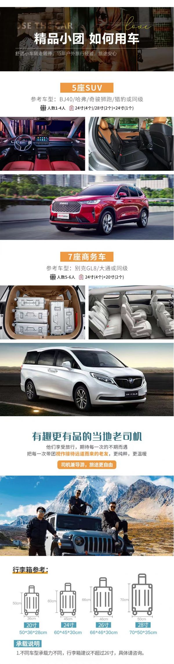 交通:2-6人VIP私享小團全程suv/舒適商務車出行;車型大小根據實際人數安排,且由駕駛經驗豐富的司機為您的出行保駕護航,報價包含車費、油費、停車費、維修費及司機勞務費。