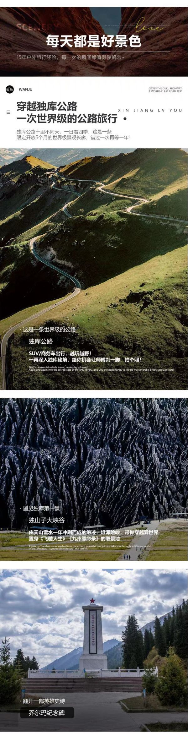 早餐后今日就踏上了傳說中一日能看到四季的【獨庫公路】,獨庫公路宛如一條巨龍盤臥天山。這條全長561公里、連接南北疆的公路,橫亙崇山峻嶺、穿越深山峽谷,貫通了南北疆,堪稱是中國公路建設史上的一座豐碑。沿途風景只能用神奇來形容,途可欣賞神秘險峻的峽谷風景,天山腹地茂密的植被和游牧風情及浩瀚的草原景色。經喬爾瑪前往唐布拉,游覽【唐布拉百里畫廊】她是原生態的,是純粹的,也是純凈的。在眾美之中,有這樣一處還未被開發,深藏閨中的風景,宛如私藏的秘境,當你撩開它的面紗,你會慢慢沉醉其間,為之傾倒,最后迷戀上它。【喬爾瑪革命烈士陵園】,喬爾瑪革命烈士陵園位于天山深處217國道旁的新疆伊犁州尼勒克縣喬爾瑪。是為了紀念為了修建天山獨庫公路而犧牲并安葬在這里的168名革命烈士而建的國家革命烈士陵園。