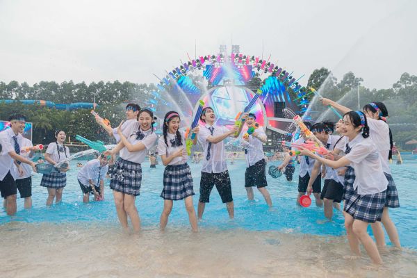 除了彩虹跑,盛夏的水上樂園也迎來了畢業生們的狂歡。在廣州長隆水上樂園,數百名來自廣州各校的畢業生們,手持各種水戰道具,在造浪池邊盡情釋壓,充分享受成績開分前極致、純粹的快樂。