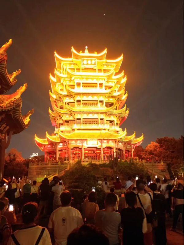 作為文化和旅游部第一批全國智慧旅游沉浸式體驗新空間培育試點項目,“夜上黃鶴樓”以黃鶴樓公園為載體,選取園內(nèi)8處景點,通過“光影+演藝”的方式,讓游客在徐徐展開的光影畫卷中走入千年歷史。