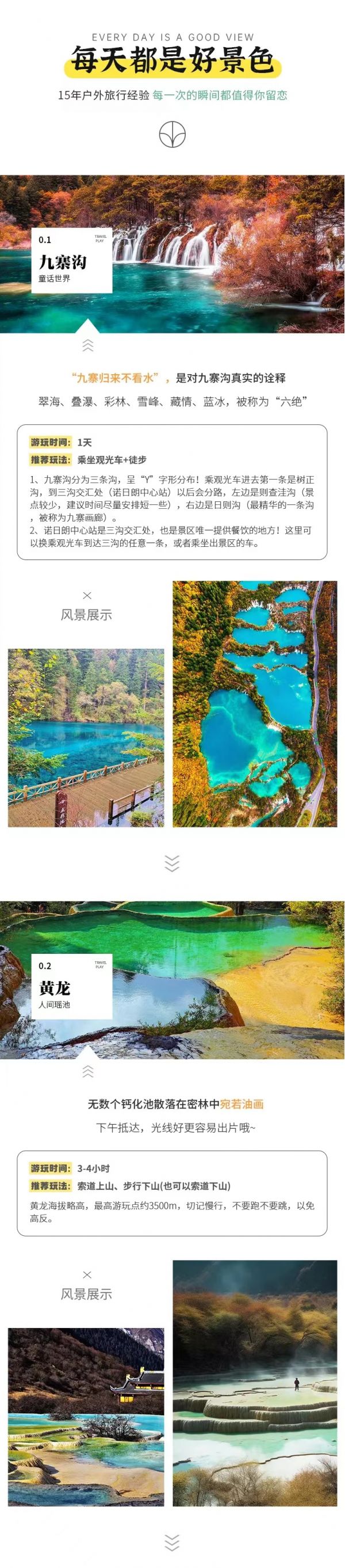 4、九寨溝景區實行分區域開放,開放區域為溝口經諾日朗瀑布至長海,扎如溝的扎如寺及日則溝的鏡海;其中,長海、五彩池、鏡海、諾日朗瀑布、樹正群海、雙龍海瀑布、扎如寺等景觀原則上為步行游覽區,具體游覽方式請聽從隨車講解員安排。