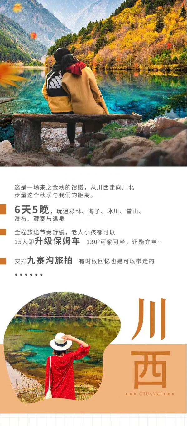 住宿:古爾溝酒店標間說明”早晨從成都酒店出發,途徑都江堰高速,沿岷江而上,沿途車覽紫坪埔水利工程、地震遺址,然后經汶川,欣賞地震后的羌鄉新風景、汶川新農村建設,過理縣,前往【畢棚溝】游覽,畢棚溝有著“小九寨”的美譽,每到10-11月,楓樹、樺樹、鵝掌松、落葉松等都被染成絢麗的鮮紅色和金黃色,儼然是一個五彩斑斕的世界。進入景區后,乘坐觀光車(60元/人,費用自理,必須乘坐)穿過原始森林到達【龍王海】、【娜姆湖】、【上海子】等,沿途可將溝內原始森林、漫山遍野的紅葉、神圣雪山、林立奇峰、瀑布飛掛等美景盡收眼底。游覽后前往【古爾溝】鎮入住,晚上可以泡泡溫泉,放松放松。