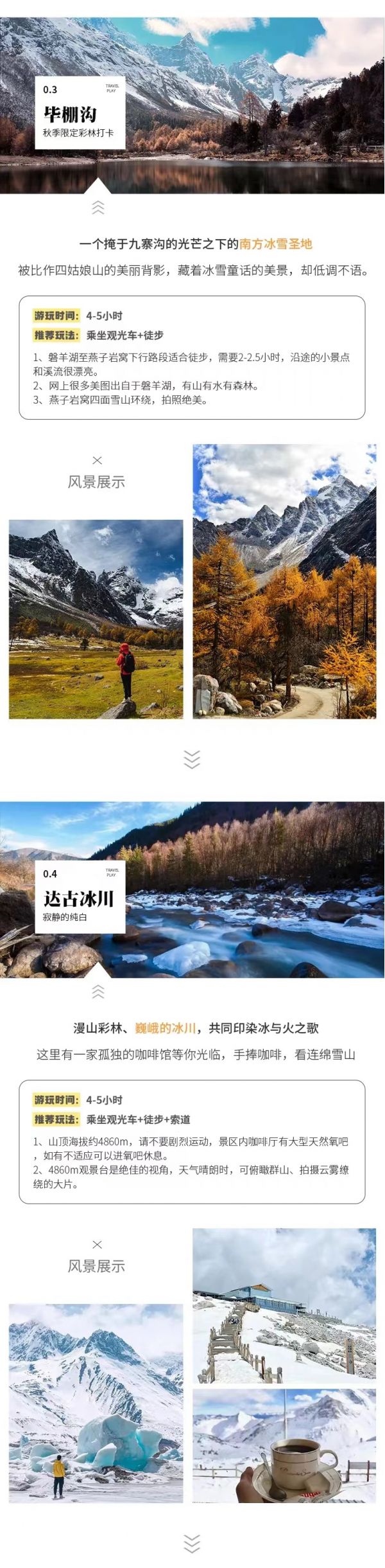 隨后游覽【紅軍湖】、【紅軍橋】、【神牛湖】,欣賞沿途的美景。后到達索道下站,也就是觀光車終點站,從這里開始就是達古冰川的精華景點,10-11月紅葉彩林漫山遍野,層林盡染,猶如一幅彩色油畫。我們可以在索道下站坐索道直接上到山頂的冰川腹地,看連綿雪山冰川,觀賞【一號冰川】,感受一覽眾山小,俯視一切的雄壯氣概。還可以在世界上海拔最高的咖啡館,同時也被稱為【世界上最孤獨的咖啡館】,喝上一杯咖啡,飽覽美景??催^冰山下的秋景前往黑水縣入住。