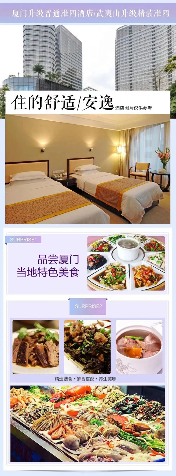早餐后游覽【南普陀】(60分鐘)全國唯一佛教學院,著名高僧弘一法師曾在此開壇講法,在東南亞一帶影響很大,寺前【放生池】游客可自主喂池內靈龜,以求好運。仰望【萬壽塔】建筑雄偉莊嚴,寺后的五老峰可登高遠眺,還有素齋與素餅味道正宗。觀著名學府中國的“斯坦福”【廈門大學外景】 后乘輪渡“海上花園”、“音樂之鄉”之美譽的【鼓浪嶼】(約2個小時)。參觀著名婦科醫生林巧稚醫生的紀念園【毓園】漫步【港仔后沙灘】港仔后的海面又名金帶水。站在沙灘上,面朝大海,背面就是日光巖,可以看到最高處光禿禿的巖石,所以這里風景還是很美的。【小巷迷失】不管是匆匆的游客還是小住幾天的過客,都喜歡漫步在鼓浪嶼的幾條小路上,一邊領略藍天碧海的壯美,一邊體驗小島的自然景色和人文的交融。