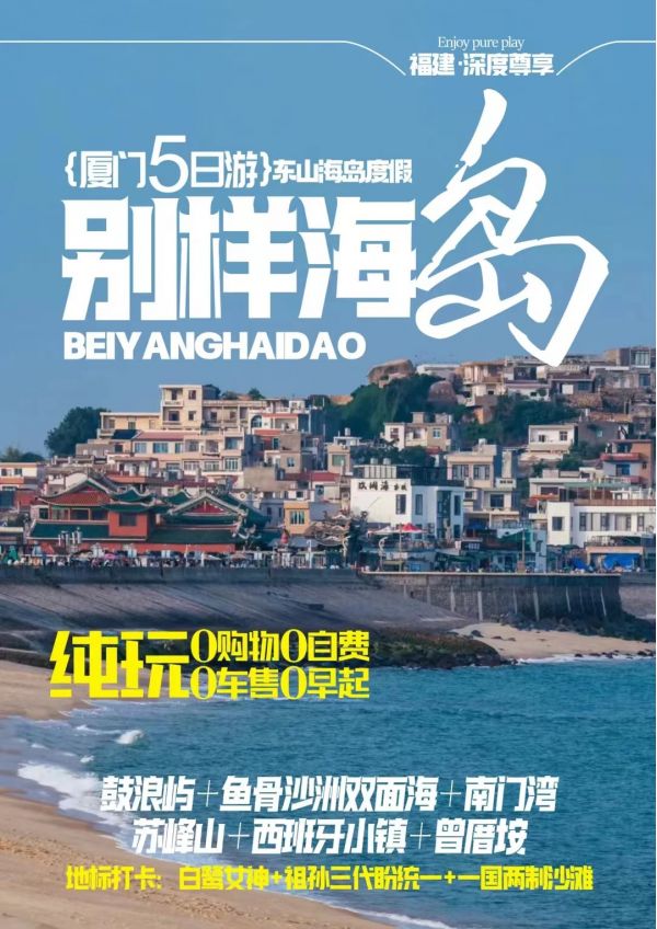 廈門、夜宿鼓浪嶼、旅拍鼓浪嶼、東山島魚骨沙洲雙面海、西班牙卡達凱斯小鎮(zhèn)深度游雙飛五日(行程供參考,導(dǎo)游在不減少景點的情況下會根據(jù)實際情況相應(yīng)調(diào)整游覽順序)