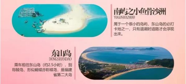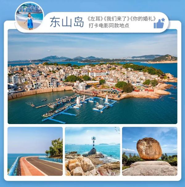 東山島:別稱陵島,形似蝴蝶亦稱蝶島,是福建省第二大島,曾獲得福建省最佳旅 游目的地、福建省“十大旅游品牌”、‘福建十大美麗海島’‘等榮譽。在東山島還拍攝過《八仙過?!贰段饔斡洝?《左耳》《我是誰的寶貝》《我們來了第二季東山站)》等影視娛樂作品!