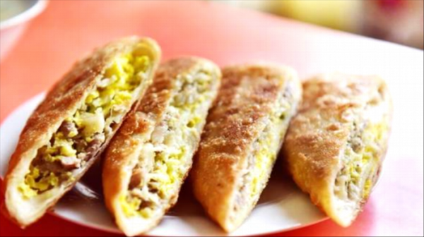 切開的呱嗒色澤金黃,緊實度很高,確實如當?shù)厝丝谥械摹?strong>呱嗒”,名字雖怪,但著實好吃。這呱嗒味兒香餡兒滿,那薄薄的酥脆的外皮包裹著味道鮮美的肉和蛋,上、中、下三層均勻地混合在一起,看著就讓人垂涎欲滴。