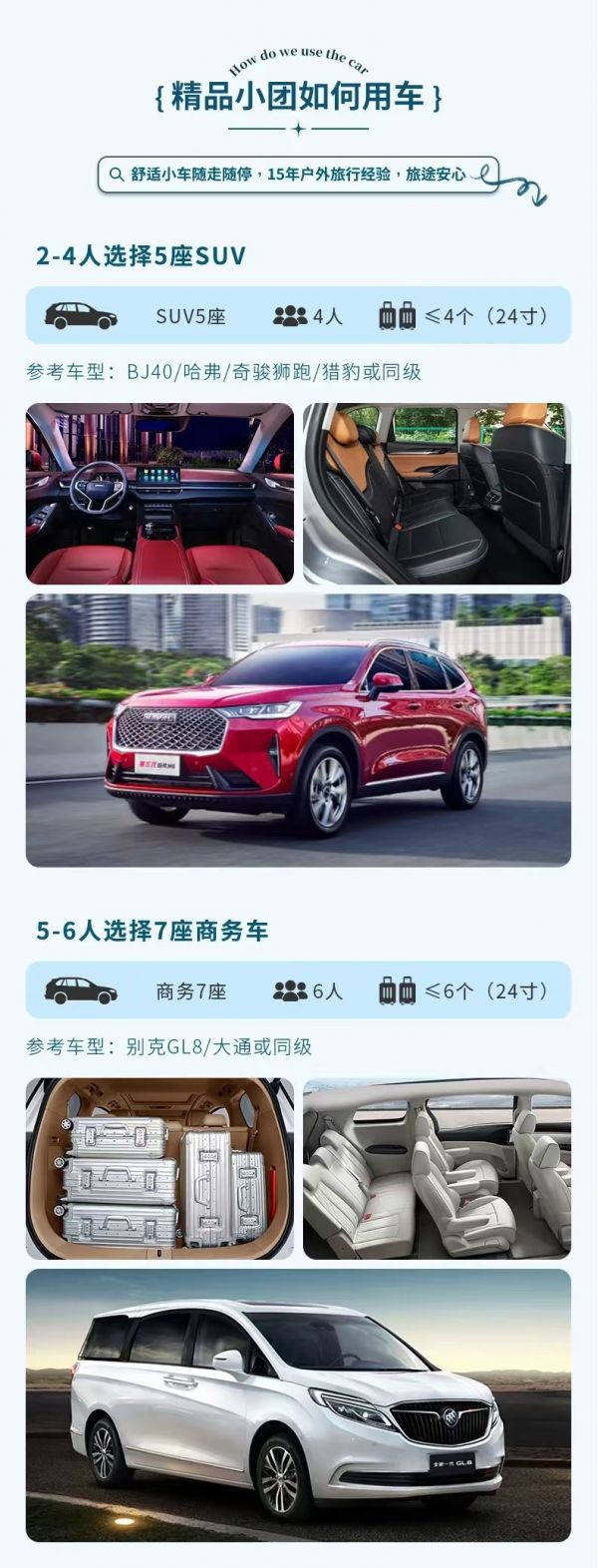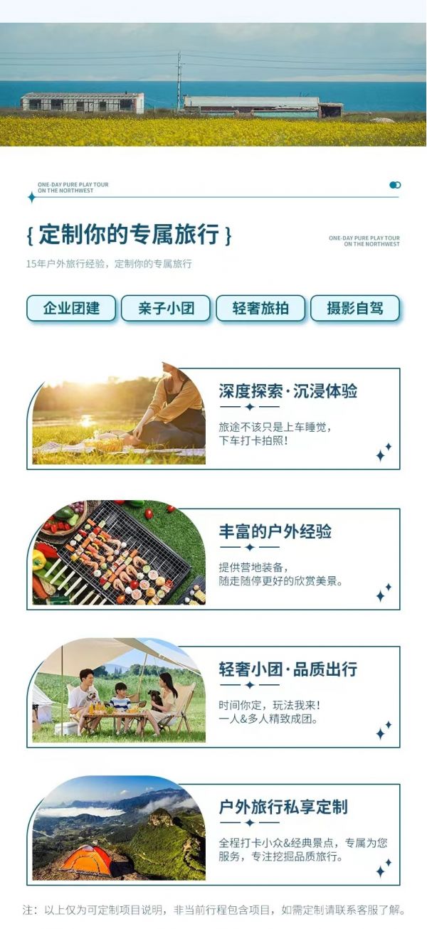 私人訂制:我們業務范圍囊括了全國各大城市,川西、西北、新疆、西藏,在路上永遠有我們的身影。我們將為每一個有定制需求的你策劃出獨屬于自己的完美旅行。