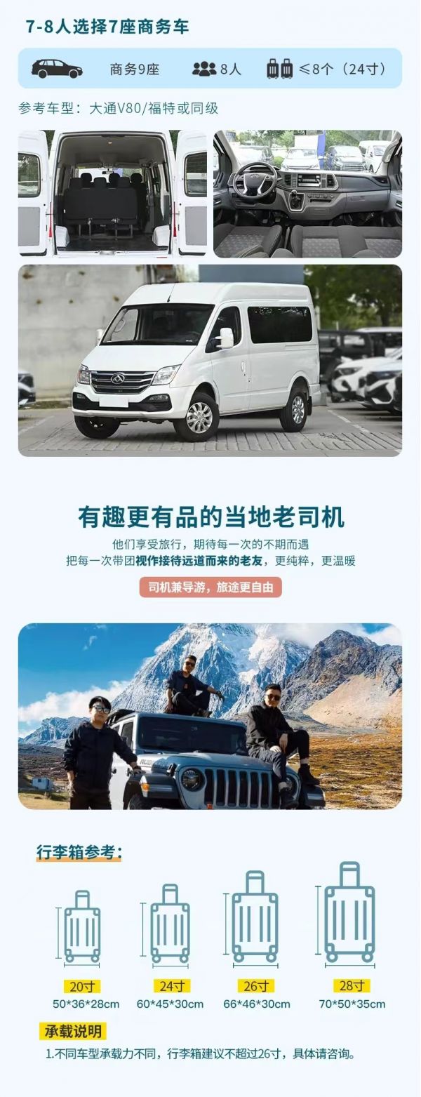 交通:2-8人VIP私享小團,全程舒適商務車出行,車型大小根據實際人數安排,保證一人一正座位,且由駕駛經驗豐富的司機為您的出行保駕護航,報價包含車費、油費、停車費、維修費及司機勞務費。住宿:行程所列6晚住宿。我們會提供行程內展示照片的酒店或其他條件相似酒店,但因沿途條件有限,如酒店設施達不到您的期望,請您諒解。