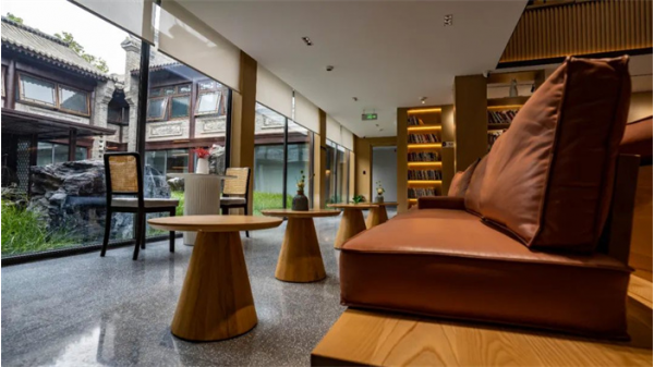 海源雅集不負其名,在設計風格上融入中國傳統(tǒng)文化的元素,取“山水相問”之意境,松柏、石橋、山水、亭榭寫意于方靜之內(nèi),呼應“天圓地方”,極具巧思。在功能分區(qū)上,既有禪意的茶舍,又有安靜閱讀的書吧,還有較為私密的小包間,滿足不同需求。房間分別用春澤、夏嬋、雁秋、冬歸用作包間的名稱,特別有禪意。酒店的大廳就是書房,一頁頁書本形狀的吊燈,像一片片潔白輕盈的羽毛掛在房頂,讓人望之生靜,整顆心都安靜下來。