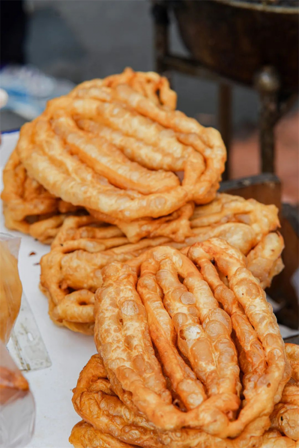 在聊城,有一種地道的街邊小吃,雖不起眼但味道十分誘人,那就是老一輩聊城人都十分的熟悉的八批果子。“八批果子”形如其名,炸制成的果子分為八條,兩端相連,呈現(xiàn)橢圓形,當它放入油鍋中逐漸變色、膨脹,油炸食品的獨特香味也愈來愈深,輕輕扯下一批放入口中,滿口酥脆,食之難忘。八批果子加到燒餅中一起吃,是聊城人非常喜歡的一種搭配,燒餅的酥軟加上八批果子的酥脆營造出獨特的口感,吃過一口便唇齒留香。