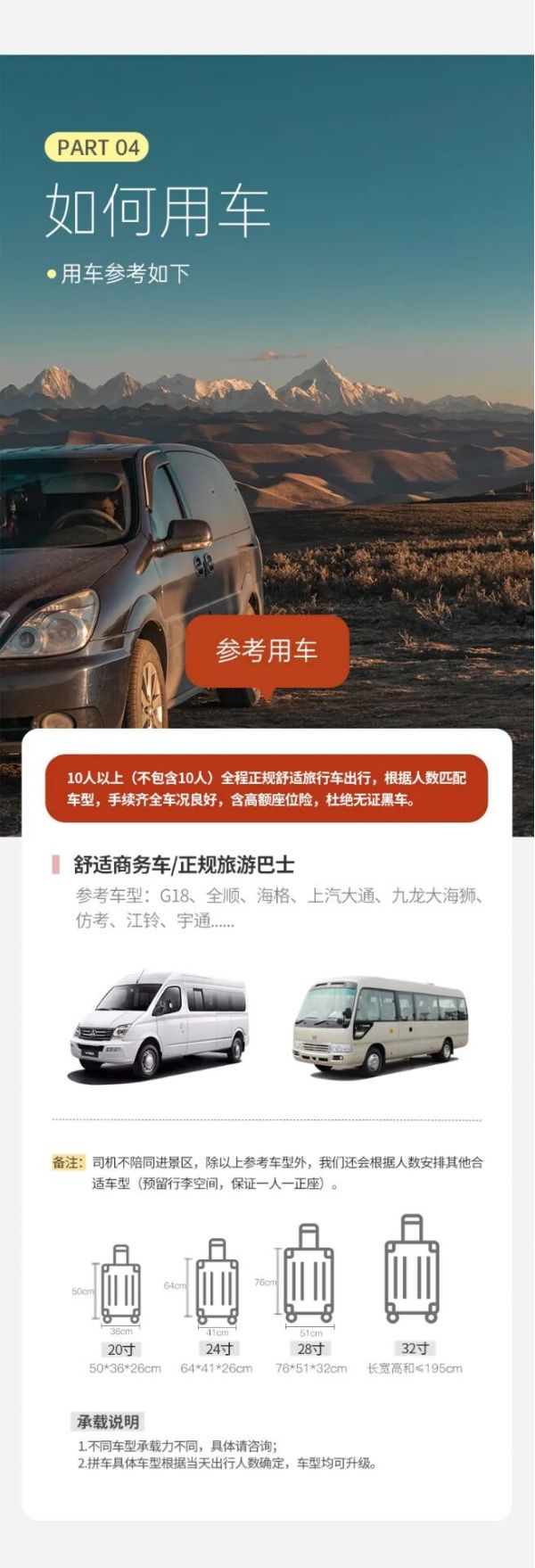 用車:車型根據(jù)人數(shù)決定,保證每人一正座;包含司機(jī)一名、油費(fèi)、過路費(fèi)、停車費(fèi),包含從出發(fā)地到景點(diǎn)及酒店費(fèi)用,不包含晚間自由活動交通;