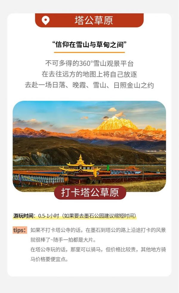 ? 【塔公草原】這是一處令人驚喜的取景地,塔公沿路野花盡享盛放,綠茵茵的草地上偶爾有白底藍(lán)色圖案的賬蓬隨意地支著,可能還會有牦牛、馬或羊等悠閑吃草的身影闖進(jìn)視野里,你的心情也會變得明朗而隨意起來,游覽時間約1H。