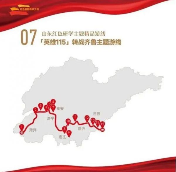 1. 菏澤市湖西人民會議廳舊址——2.濟寧市翟莊黨支部舊址——3.棗莊市滕州微山湖紅荷濕地景區(qū)——4.棗莊市津浦鐵路臨城站舊址——5.濟寧市微山湖旅游區(qū)——6.濟寧市微山縣劉少奇過湖處遺址——7.煙臺市招遠羅山黃金生態(tài)旅游區(qū)