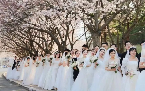 中國(guó)海洋大學(xué)在櫻花樹(shù)下舉辦2024校友集體婚禮