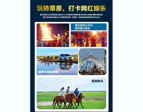 7:煙花篝火晚會(huì)、3-4小時(shí)越野車穿越草原沙地、騎馬、射箭、穿蒙古袍拍照、滑沙、灤河源頭漂流、公主湖草原度假區(qū)馬術(shù)劇《英雄》震撼的馬戰(zhàn)實(shí)景表演等娛樂(lè)項(xiàng)目全含。