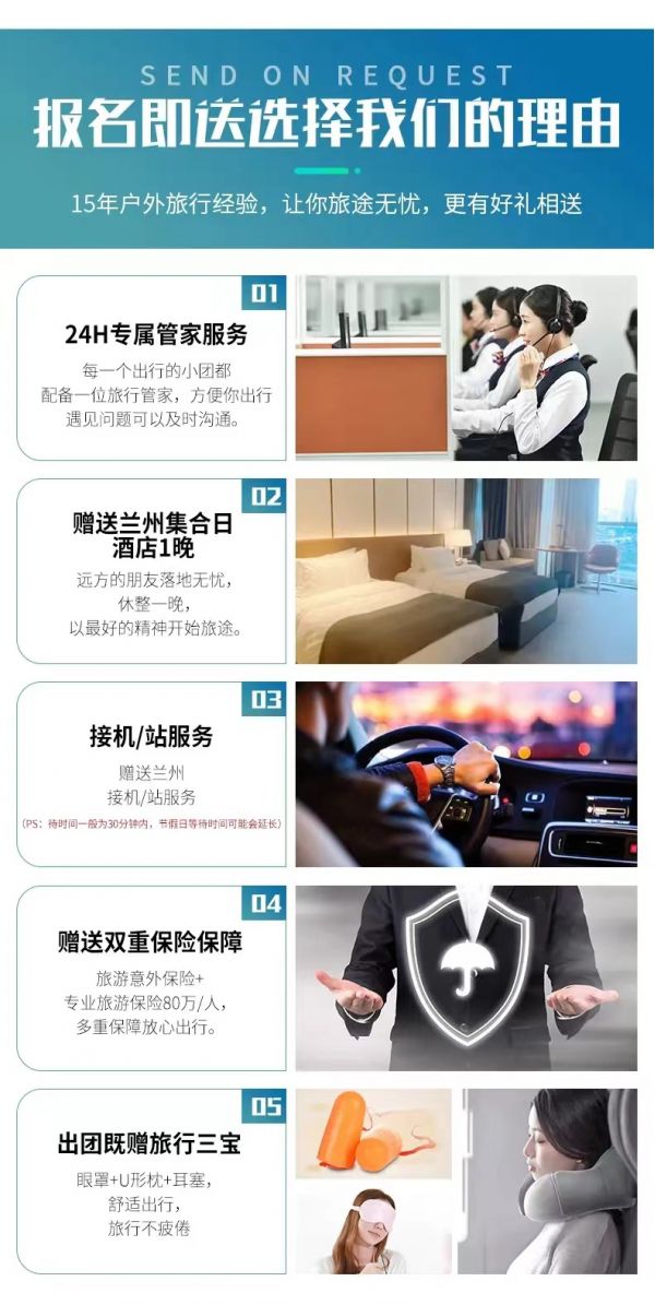 接站服務(wù):2人及以上免費(fèi)提供蘭州市區(qū)拼車接火車服務(wù),接火車的工作人員會在您出發(fā)日期前一天21:30之前向您推送消息并與您聯(lián)系,如果超過時間沒有接到任何通知,請及時與領(lǐng)隊或報名處聯(lián)系。(節(jié)假日用車人數(shù)較多情況下客人等待時間可能會延長;我方會安排臨近航班拼車接站,如遇其他客人航班火車延誤晚點(diǎn)情況,等待時間可能會延長,敬請諒解)