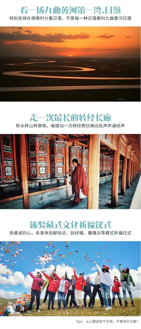 繼續(xù)往前【拉卜楞寺】,有“世界佛學(xué)院”之稱的【拉卜楞寺】。拉卜楞寺是藏傳佛教格魯派六大宗主寺之一 , 規(guī)模僅次于布達(dá)拉宮,是藏傳佛教格魯派最高佛學(xué)學(xué)府之一,被世界譽(yù)為“世界藏學(xué)府”,相當(dāng)于我們眼中的“清華北大”。在漫長的發(fā)展中拉卜楞寺形成了獨(dú)特的藏傳佛教文化,包括建筑、學(xué)院、法會、佛教藝術(shù)、藏經(jīng)等,曾經(jīng)是甘、青、川毗鄰地區(qū)藏族的政治、宗教、文化中心。在學(xué)院堪布的帶領(lǐng)下來,進(jìn)入寺院,欣賞美麗的壁畫、唐卡,精美佛像;走過朱紅玄黃長廊,和喇嘛一起撥動轉(zhuǎn)經(jīng)筒;在這紅白相間的宏偉寺院中,看虔誠的信徒磕著等身長頭來此轉(zhuǎn)經(jīng);與僧人一起聽經(jīng)、打坐,靜靜感受這份信仰的力量。而后經(jīng)過【瑪曲】,母親河黃河這里自西南入境,復(fù)從西北出境。