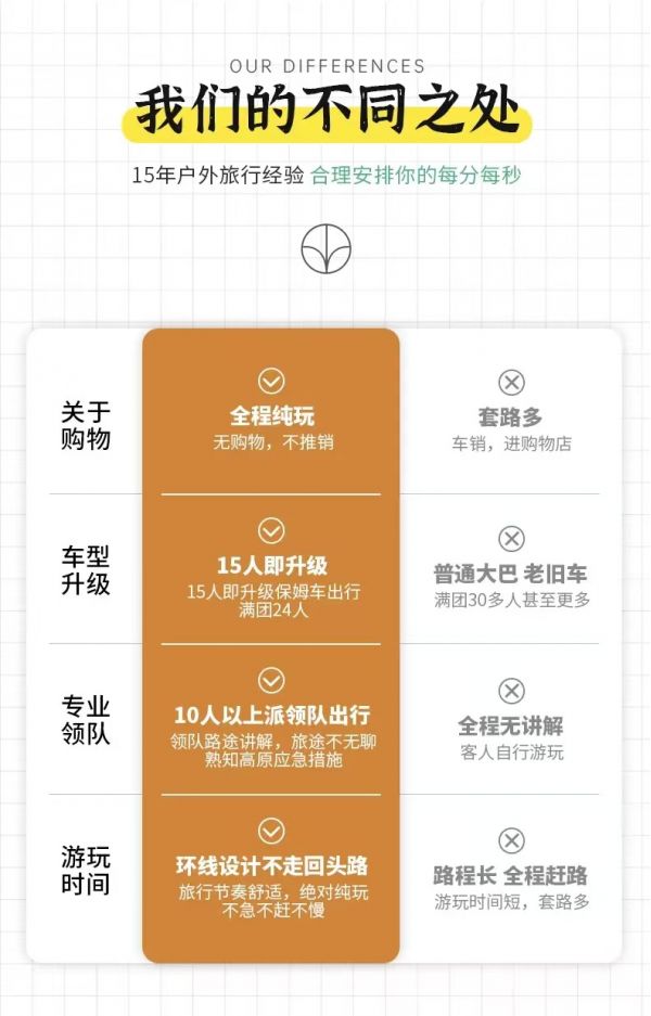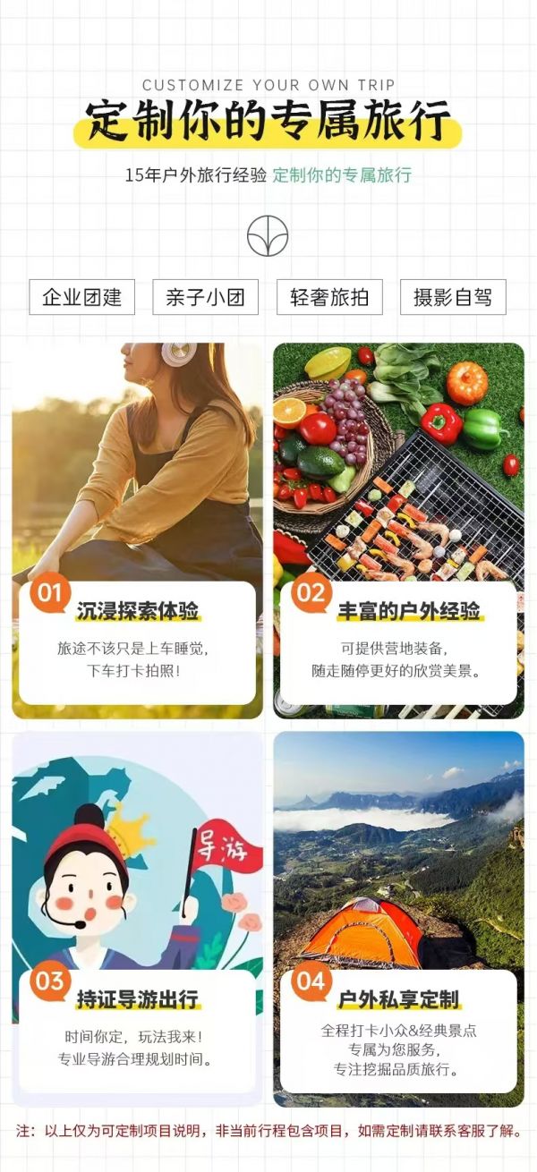 私人訂制:我們業務范圍囊括了全國各大城市,川西、西北、新疆,在路上永遠有我們的身影。我們將為每一個有定制需求的你策劃出獨屬于自己的完美旅行。