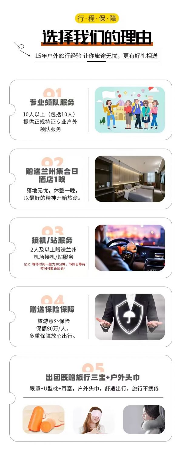 接機/站服務:2人及以上免費提供蘭州市區拼車接火車服務,接火車的工作人員會在您出發日期前一天21:30之前向您推送消息并與您聯系,如果超過時間沒有接到任何通知,請及時與領隊或報名處聯系。(節假日用車人數較多情況下客人等待時間可能會延長;我方會安排臨近航班拼車接站,如遇其他客人航班火車延誤晚點情況,等待時間可能會延長,敬請諒解)