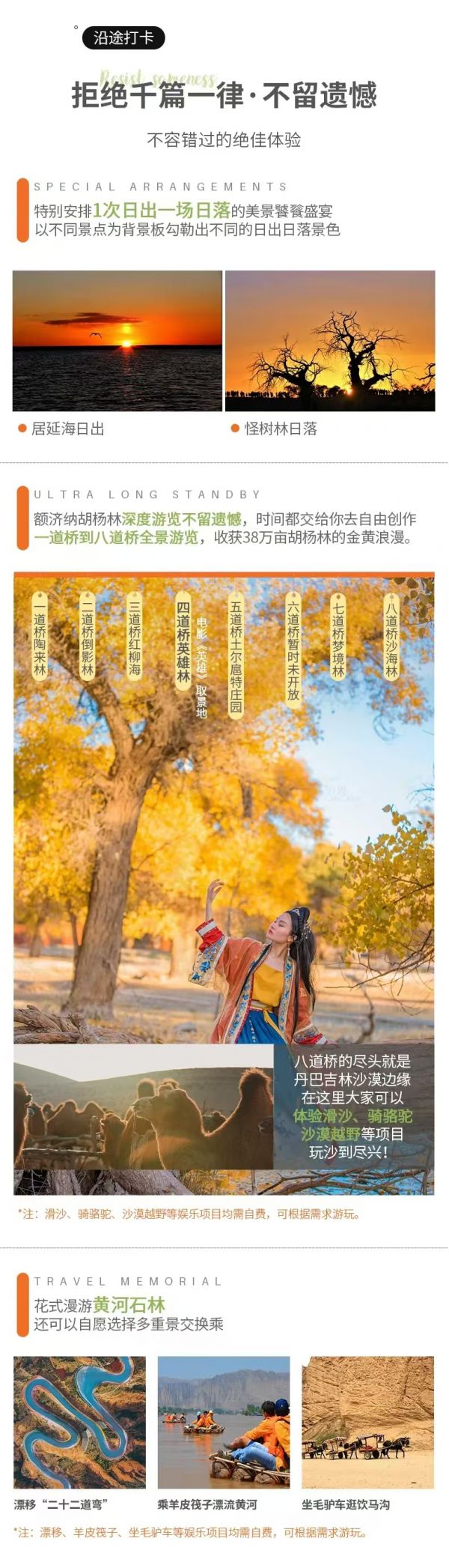 巴丹吉林沙漠自費項目(沙漠越野、踏板滑沙、駱駝騎行等),黃河石林景區自費項目(羊皮筏子、毛驢車等)