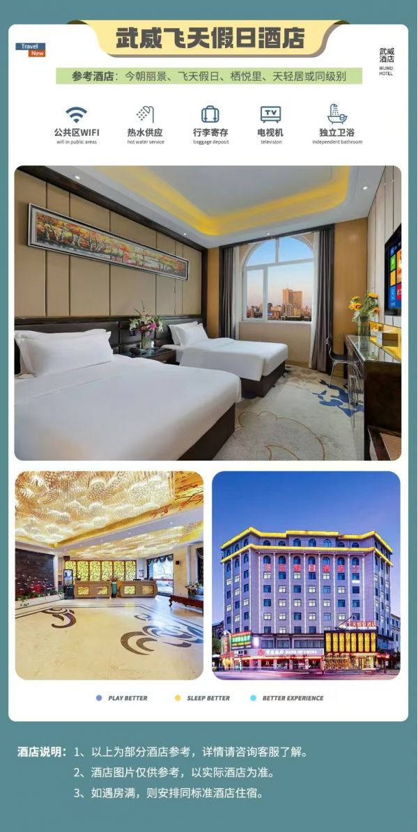 tips:蘭州集合酒店為贈送酒店,酒店以實際安排為準均不退不換不指定,如要更改酒店產生的費用需要自行承擔。