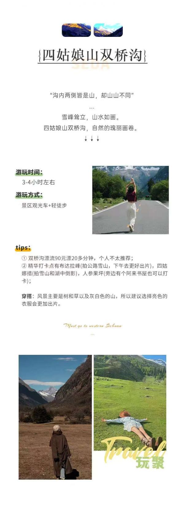 溫馨提示:四姑娘山海拔較高,可能會有輕微的高反癥狀,如頭暈、氣短等,可提前準備一些抗高反藥物。山區氣候多變,記得帶上保暖衣物和雨具。