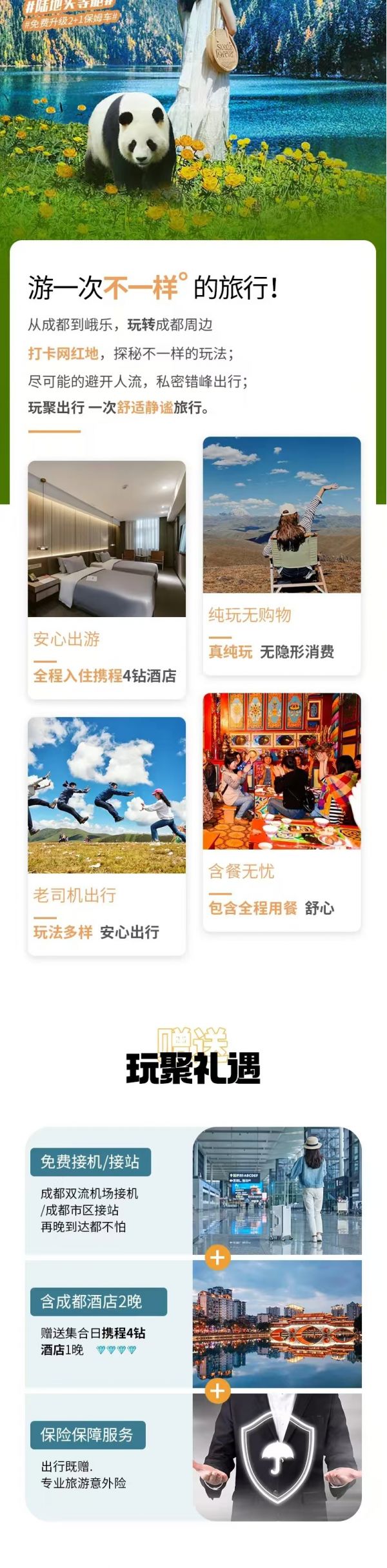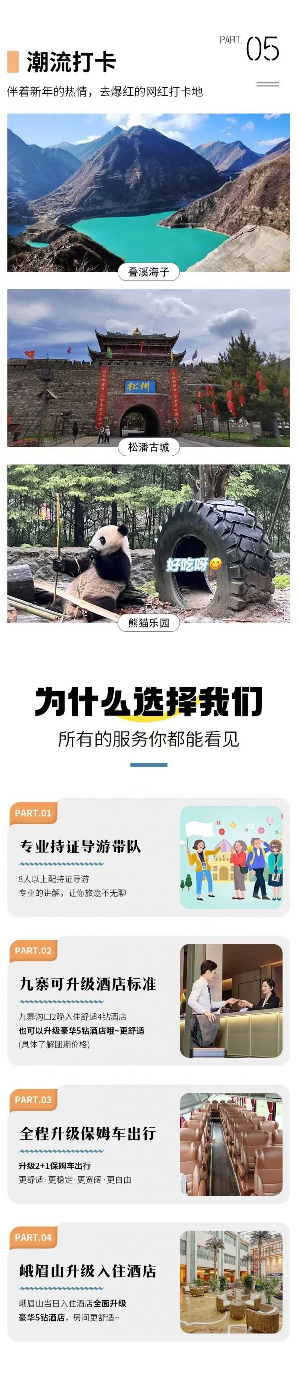 贈送:九寨溝景區旅拍2張精修+底片全送(電子版)、峨眉山溫泉體驗、川劇變臉表演晚會、專業旅游意外險(不含財產險)、2人以上24H成都雙流機場接機/成都市區車站接站