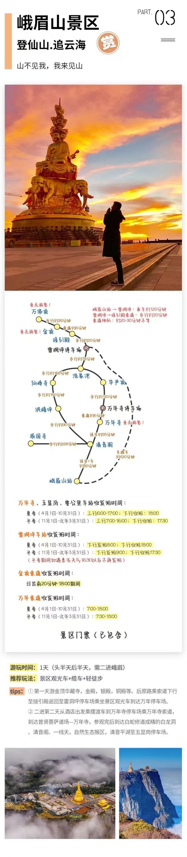 峨眉山觀光車90元/人(必須)、金頂索道上行65元/人(必須)+下行55元/人(建議)、萬年寺索道上行65元/人(必須)、普賢菩薩道場-萬年寺10元/人(必須);