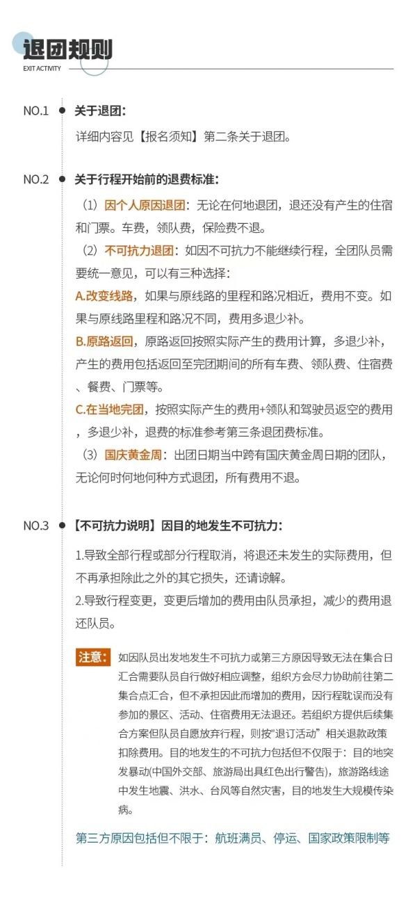不可抗力:因不可抗力因素造成團隊行程更改、延誤、滯留或提前結束時,旅行社可根據當時的情況全權處理,如生費用增減,按未發生費用退還游客,超支費用由游客承擔的辦法處理。