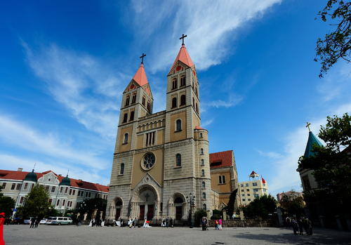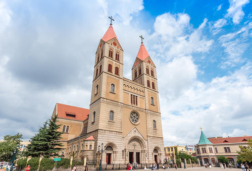 早7:00集合出發,預計12:00到達青島天主教堂。后自由游覽,預計時間1小時。教堂以黃色花青島天主教堂崗巖和鋼筋混凝土砌成,表面雕以簡潔優美的紋案。窗戶為半圓拱形,線條流暢,顯得莊重而樸素。大門上方設一巨大玫瑰窗,兩側各聳立一座鐘塔,塔身高56米,紅瓦覆蓋的錐形塔尖上各豎立一個4.5米高的巨大十字架,塔內懸有四口大鐘,一旦鐘樂鳴奏,聲傳數里之外。