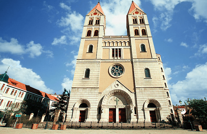 青島天主教堂本名天主教青島教區浙江路圣彌厄爾教堂。青島天主教圣彌厄爾大教堂于1932年破土動工,由德國設計師畢婁哈依據哥特式和羅馬式建筑風格而設計,1934年10月落成,歷時兩年半多。擬建教堂應高百米,適逢二戰爆發,希特勒嚴禁德國本土資金外流,該教堂不得不修改圖紙,即建成現在規模 。