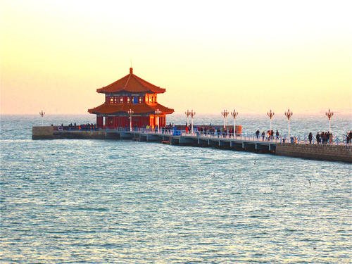 青島棧橋始建于清光緒十八年(1892年),是青島最早的軍事專用人工碼頭建筑,是青島的重要標志性建筑物和著名風景游覽點 。青島棧橋全長440米,寬8米,鋼混結構。橋南端筑半圓形防波堤,堤內建有民族形式的兩層八角樓,名“回瀾閣”,游人佇立閣旁,欣賞層層巨浪涌來,“飛閣回瀾”被譽為“青島十景”之一。